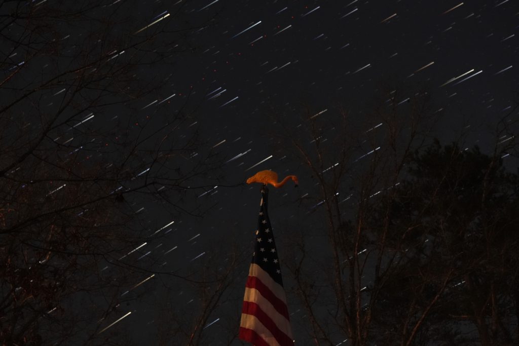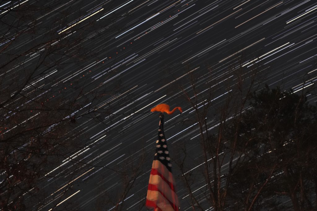 When you have a flock of flamingos running around, they tend to end up in front of the camera. While I was setting up my camera for tonight’s star trails, Mr. Beaks thought it would be funny to perch on top of the flagpole. He refused to budge so I decided to make him part of the shot.